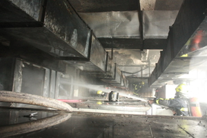 10時(shí)59分,北苑消防中隊(duì)作為第一力量到達(dá)火災(zāi)現(xiàn)場(chǎng)。經(jīng)過偵查后發(fā)現(xiàn)起火現(xiàn)場(chǎng)為四層鋼混結(jié)構(gòu)建筑,廠區(qū)內(nèi)呈回字形結(jié)構(gòu)共有3家企業(yè)以及一個(gè)副食品倉庫。副食品倉庫和偉靈電鍍廠在同一棟建筑內(nèi),毗鄰建筑為創(chuàng)美家具有限公司廠房。起火地點(diǎn)位于廠區(qū)右側(cè)3樓偉靈電鍍廠車間,由于機(jī)器內(nèi)部含有大量油漆、瀝青等材料,火勢(shì)燃燒十分猛烈。根據(jù)現(xiàn)場(chǎng)情況,消防隊(duì)員立即展開滅火戰(zhàn)斗,現(xiàn)場(chǎng)指揮員立即下令把現(xiàn)場(chǎng)攻堅(jiān)組官兵分成兩個(gè)小組分別從兩側(cè)樓梯上樓內(nèi)攻,防止火勢(shì)向周邊蔓延。當(dāng)消防員來到3樓車間內(nèi)時(shí)發(fā)現(xiàn)車間里面的機(jī)器由多個(gè)封閉的鐵箱子組成。內(nèi)部油漆原料燃燒后冒出大量濃煙,溫度非常高。消防員進(jìn)入后難以接近起火點(diǎn)。經(jīng)過現(xiàn)場(chǎng)指揮員分析后決定先利用水槍對(duì)起火機(jī)器進(jìn)行冷卻,然后對(duì)機(jī)器箱體進(jìn)行破拆,最后出多支水槍打擊火勢(shì)。
