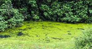 水塘靠近公路的一旁長(zhǎng)滿了浮萍,水塘水黑如墨